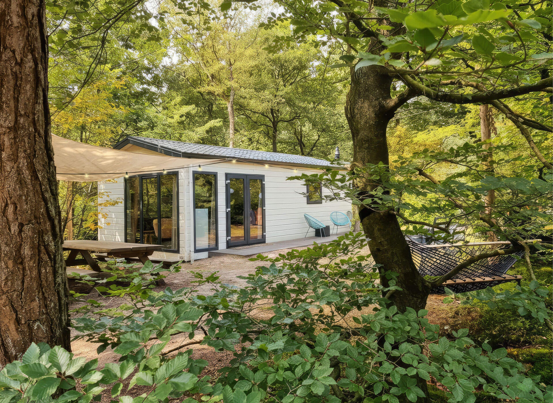 De tuin bij het huisje is groot genoeg om er naast de hottub, barbecue, grote picknicktafel, schuurtje en verschillende zitjes ook nog steeds lekker je kinderen te kunnen laten spelen.